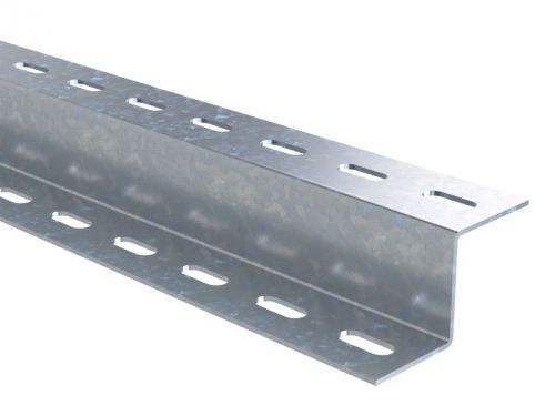 Z-образный профиль изготовлен из стали толщиной 2,5 мм. Он имеет длину 1000 мм. Элемент этого типа может применяться для организации подвеса оборудования к потолку или стенам, а также для прокладки вертикальных трасс.